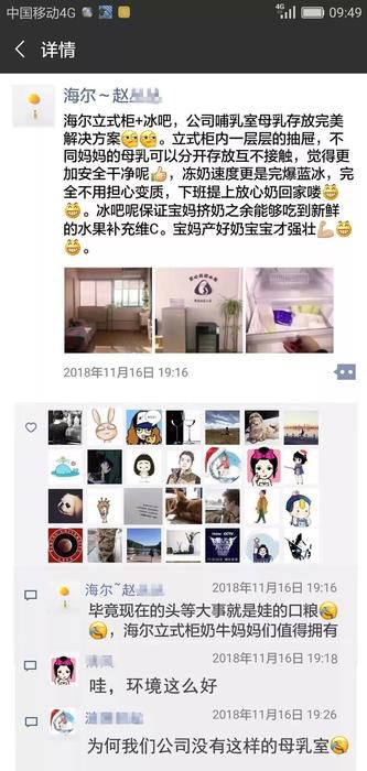 近日,在海尔工作的赵女士在朋友圈,晒出三张“海尔爱心妈妈室”图片,并配文“公司哺乳室母乳存放完美解决方案,海尔立式柜多层抽屉,分储不同妈妈母乳,安全、防变质,下班带放心奶回家!”收获了不少朋友点赞。