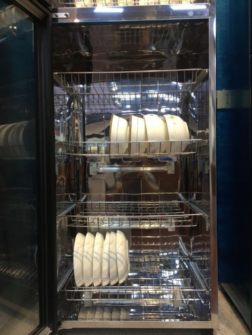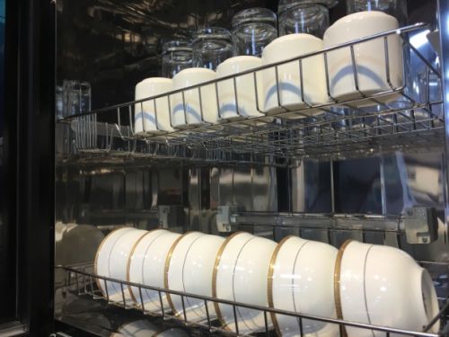 不同材质的餐具在立式消毒柜中的摆放位置是不同的,塑料和一些不耐高温的餐具需要放在立式消毒柜的上室中温消毒区,玻璃和陶瓷材质的餐具应该放在立式消毒柜的下室高温消毒区。而彩釉陶瓷不能放入消毒柜中,因为高温会让彩瓷中的铅、镉的等重金属溢出,有害物质分解之后反而还会污染餐具。然而,餐具要正确摆放,摆放杯子时,杯口向下,可使臭氧与温度更好深入杯中消毒。摆放碗碟时,按孔位立放,切勿平方堆叠影响消毒效果。注意,放置餐具前应沥干水份,或擦拭余水。