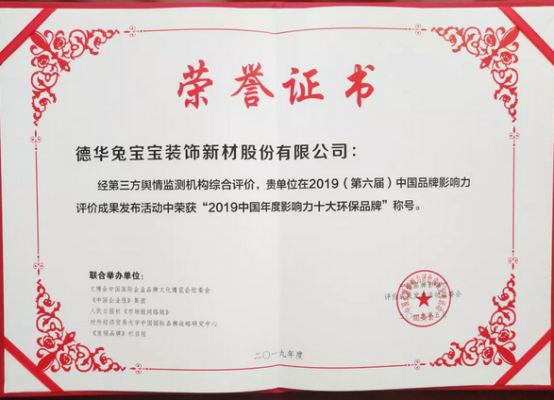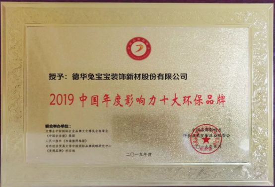 △兔宝宝荣获“2019中国年度影响力十大环保品牌”称号