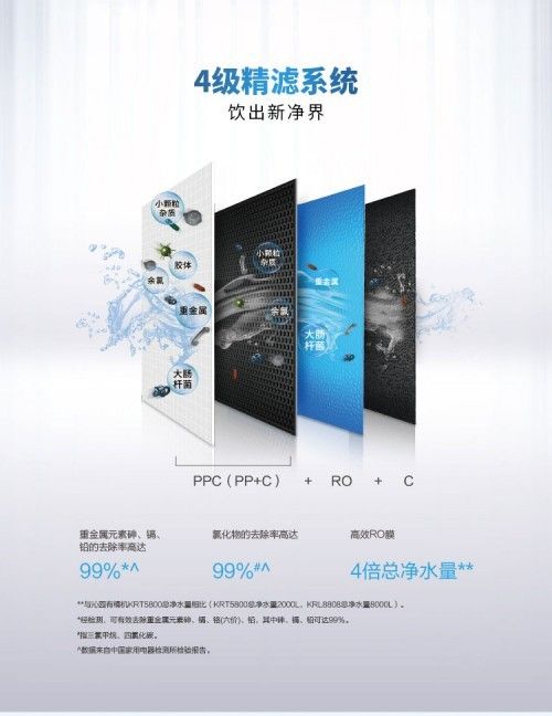 而沁园KRL8808采用的三芯四级RO膜精滤技术,能够有效去除水中的小颗粒杂质、余氯、大肠杆菌、重金属离子等,其中对于氯化物及铅、镉、砷等重金属元素的去除率高达99%,保证滤出的都是纯净无杂质的水,不会对宝宝产生身体负担。