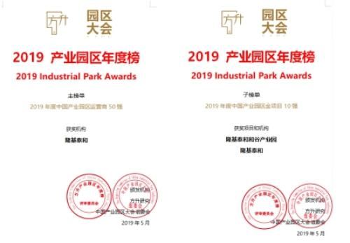 2019年5月22日,在“2019第五届中国产业园区大会”上,隆基泰和凭借前瞻性的产业规划及全方位的产业运营能力荣获“2019年度中国产业园区运营商50强”第12名。此外,在“2019年度中国产业园区金项目”的评比中,隆基泰和旗下和谷产业园入围十强。