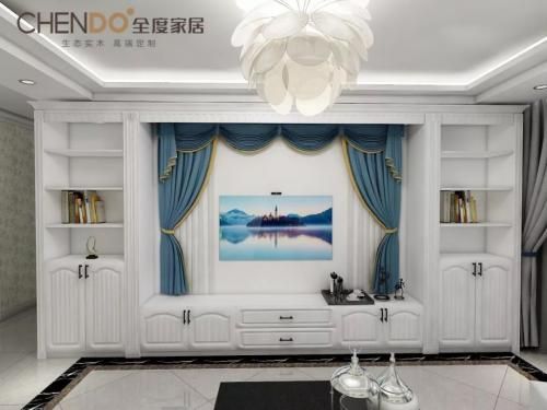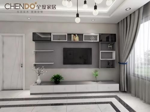 封闭式电视柜现在在居室的设计中还不是很常见,但是符合现代居室生活的大众审美,还有一个优点是巧用入墙的空间,外观平整适合视距充裕,电视墙面比较宽裕的客厅。