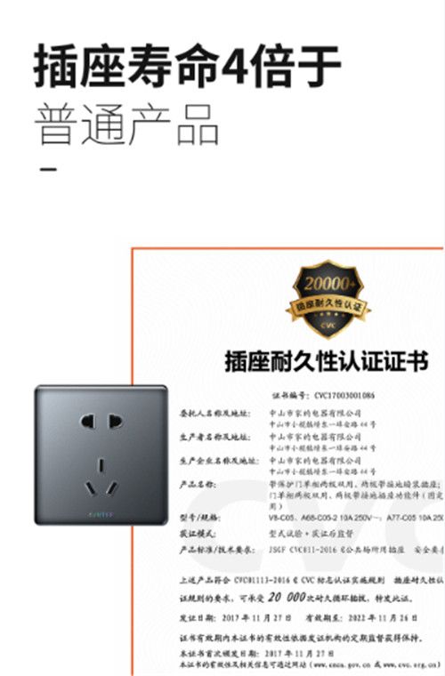 1、插座寿命更长。V12魅彩系列开关,可承受20000次耐久循环插拔不松动,是国标(5000次)的4倍。这意味着,它的使用寿命是普通插座的4倍左右!