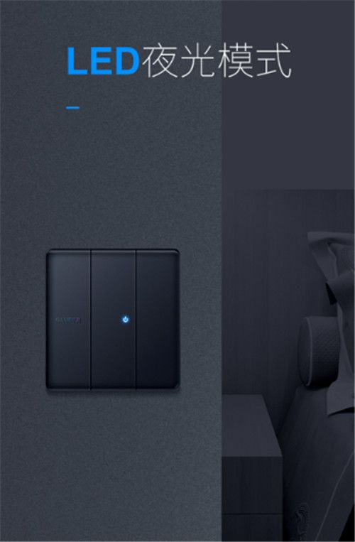 3、LED指示。开关上的LED灯,准确指示开关通断状态,同时方便用户在黑暗中寻找开关位置。