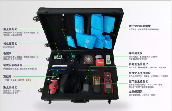 业之峰环保量房箱,包含环保量房所必备的26种工具,可以测量出环保设计所必不可少的66个关键数据,相当于对房子做了个全面而且专业的体检诊断,为接下来的环保设计打下了坚实基础,用数据让美好生活清晰可见!