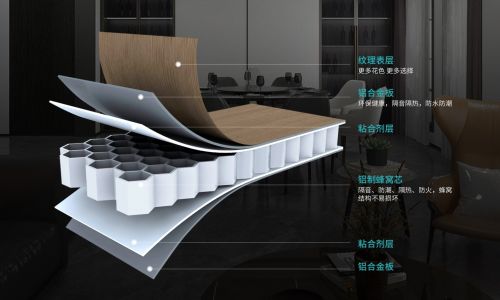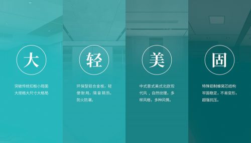 大板由于尺寸大,一定要严格选材、科学设计,以保证吊顶板材的安全性。“容者大成”系列大板采用上下6层夹心设计,除表层纹理层外,双层铝合金板和双层粘合剂层,中心采用铝制蜂窝芯。蜂窝结构的特殊性保证板材不易弯折,不易变形,不易损坏,并且整块板材具有隔音、隔热、防潮、防火的特性,比普通产品更牢固、更耐用。