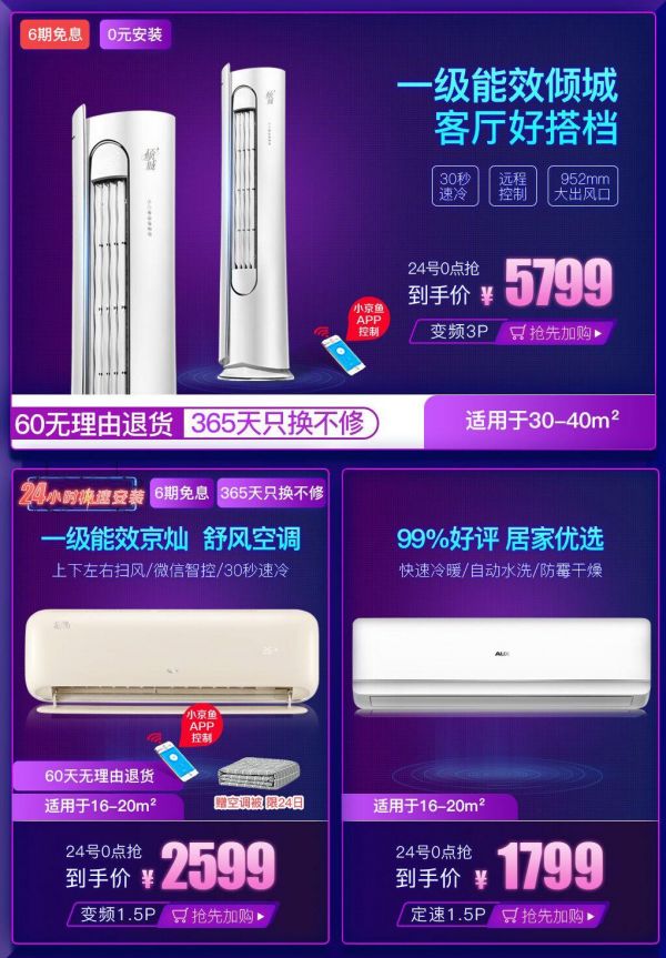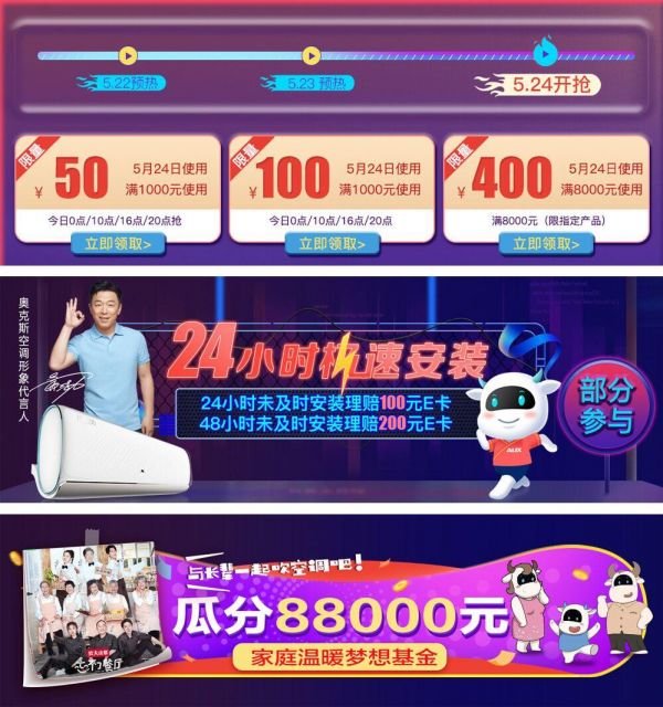 奥克斯空调“巅峰狂欢趴”今天正式开抢,爆款空调领券下单最高可减400元,而且价保618,钜惠提前享。此次促销活动除了实打实的超值优惠,对于指定爆品还有众多专属福利等你来享,包括“0元安装”、“365天只换不修”、“白条3期、6期免息”、“使用60天无理由退货”等,一举打消你的后顾之忧。另外,“爆品24小时极速安装”,让消费者享受清凉无需等待。而且消费者今天下单还可瓜分88000元“家庭温暖梦想基金”,更多优惠只等你来。