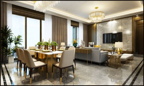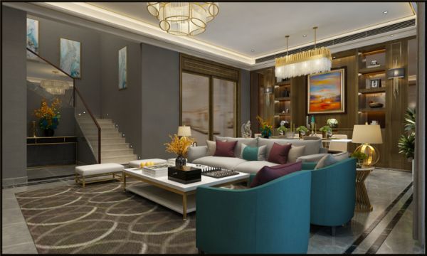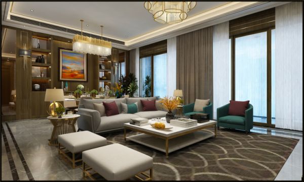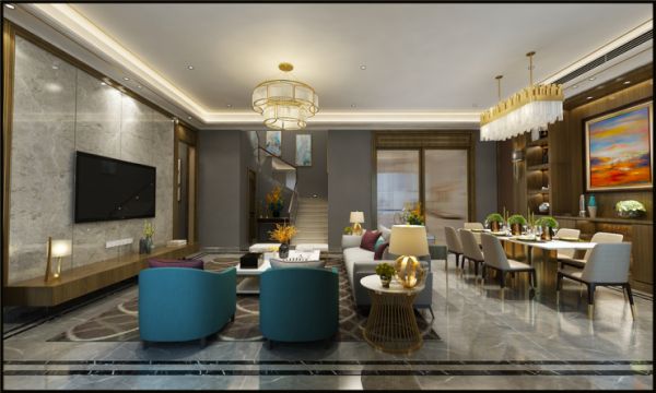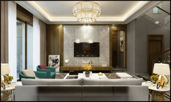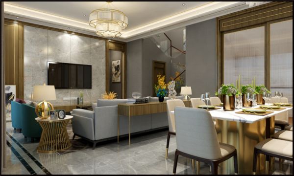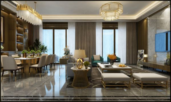 现代轻奢风格的客厅比例比较宽敞,以便最大限度地利用空间。视觉空间看起来很宽敞,灯光效果也很好。客厅家具方面,建议采用灰色色调和金属元素点缀,营造平静而不失时尚氛围。至于对于地面的装饰,可以选择感觉非常舒适的灰色系列的瓷砖来装饰,使整个客厅显得简单舒适,显露出一种奢华感。所谓轻奢以更简洁的、硬朗的直线条代替,如选用平滑的门板造型,简单的墙板等没有过多的雕刻修饰,也浓缩着意想不到的功能与细节,从而彰显了一种高品质的生活方式。如果你不满足于千篇一律的家居色调,也可以在时尚简约的现代氛围中,为空间注入一抹优雅、高贵的蓝色,一方面用于调节气氛,另一方面也能展现出典雅的迷人风情。