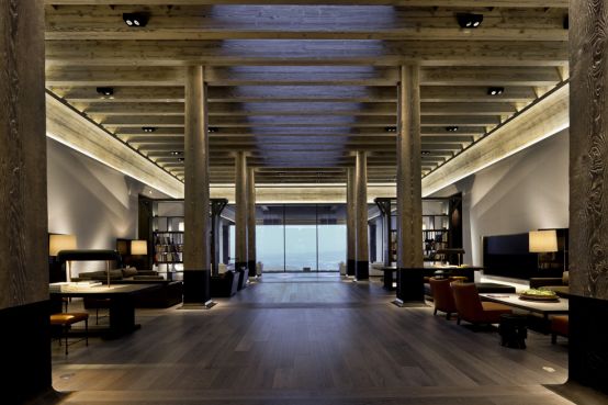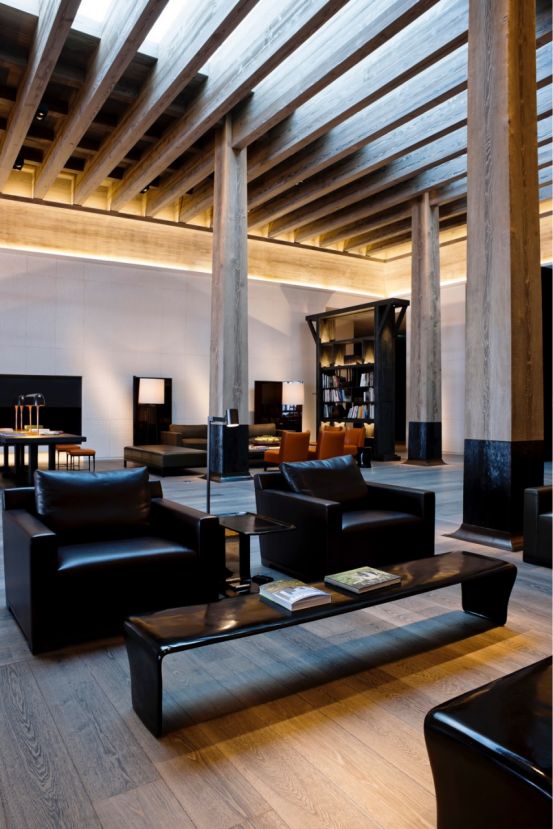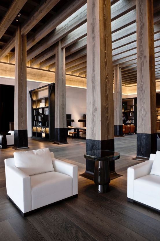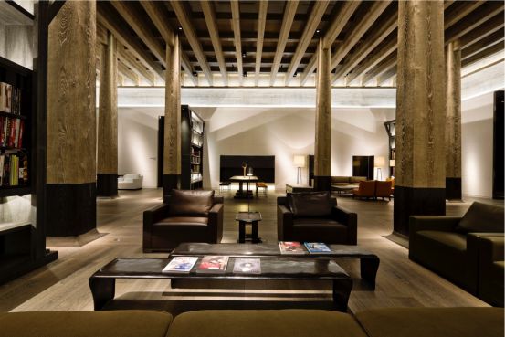 这是一个以木为主要结构和材料的大堂休息室。进入大堂,马上就会被宽阔的走道两侧几根高大的立柱吸引目光,这是采用全木制作的“顶梁柱”,繁复绚丽的木纹跃动感非常强。视线往上,是数十根排列整齐的横梁,整个前厅结构大气非凡。