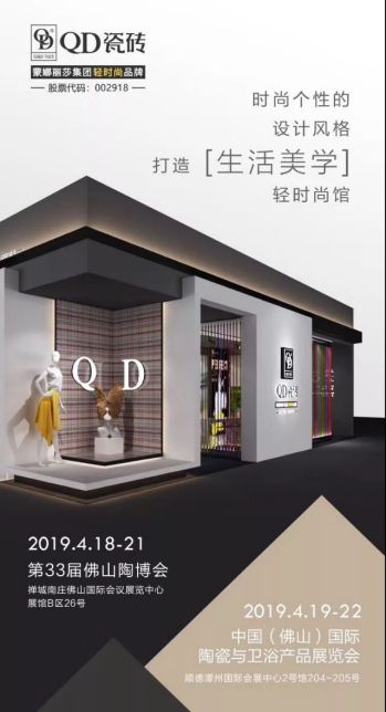 一个城市,两个展馆。以色彩为亮点,配合瓷砖之美,给您带来视觉震撼!蒙娜丽莎集团轻时尚品牌QD瓷砖与您相约:4月18日,第33届佛山陶博会。4月19日,2019中国(佛山)国际陶瓷与卫浴展览会