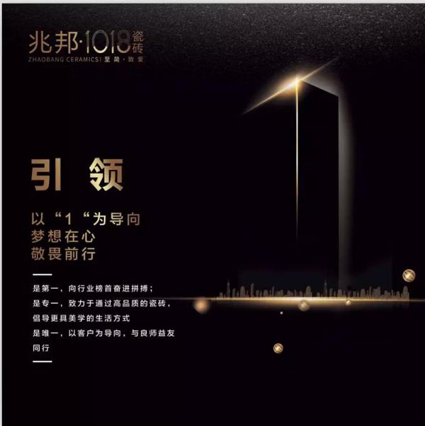 以“1“为导向,梦想在心,敬畏前行。是第一,向行业榜首奋进拼搏;是专一,致力于通过高品质的瓷砖,倡导更具美学的生活方式是唯一,以客户为导向,与良师益友同行。