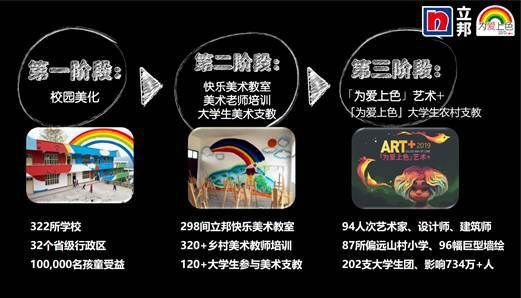 经过十年的创新和发展,「为爱上色」已成为一个可持续发展的开放式公益平台,成为独具影响力公益品牌。至今,已汇集青基会、儿慈会、陶氏、凯德、尚品宅配等超过48家NGO、媒体和企业合作伙伴。2018年,「为爱上色」更获得由美国拉根通信(Ragan Communications)和美国公关日报(PR Daily)新闻网站共同举办的拉根奖(Ragan Awards)“2018年度最佳企业社会责任荣誉奖(Corporate Social Responsibility Awards)”等三项大奖。立邦用十年的坚持,将「为爱上色」打造成为一个有温度、有色彩、有人情、充满爱的公益品牌。