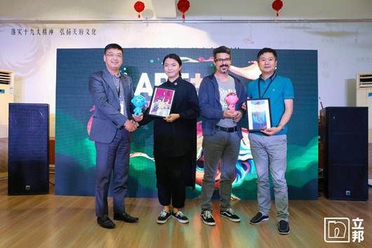 立邦工业涂料事业群总裁胡朝晖(左一)与立邦建筑涂料事业群西区生产供应链总经理邱洪良(右一)与正在成都创作的艺术家交换礼物