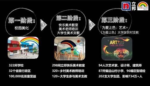 经过十年的创新和发展,「为爱上色」已成为一个可持续发展的开放式公益平台,成为独具影响力公益品牌。至今,已汇集青基会、儿慈会、陶氏、凯德、尚品宅配等超过 48 家NGO、媒体和企业合作伙伴。2018年,「为爱上色」更获得由美国拉根通信(Ragan Communications)和美国公关日报(PR Daily)新闻网站共同举办的拉根奖(Ragan Awards)“2018年度最佳企业社会责任荣誉奖(Corporate Social Responsibility Awards)”等三项大奖。立邦用十年的坚持,将「为爱上色」打造成为一个有温度、有色彩、有人情、充满爱的公益品牌。