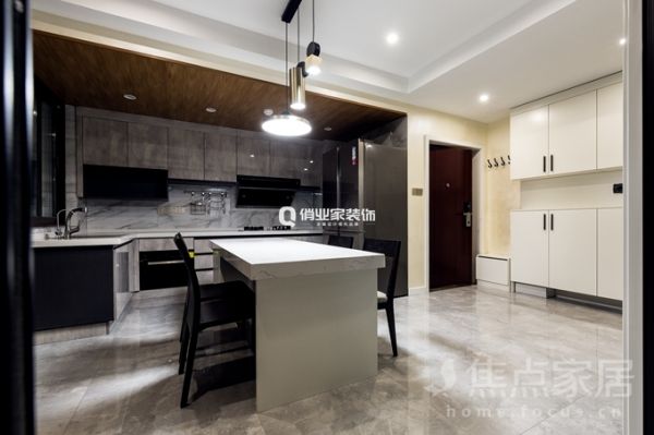 开放式餐厨设计,让原本入户变得十分大气,爵士白的台面与原木材质的吊顶相得益彰,时尚与惬意兼具。