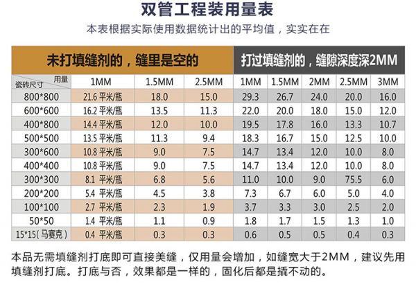 2、举例:100平的房子,铺贴800*800的瓷砖,需要多少瓶美缝剂呢。我们换算下,P=(0.8+0.8)*[100/(0.8*0.8)]/40=6.25,大概需要7瓶美缝剂,如果是600*600的瓷砖的话,P=(0.6+0.6)*[100/(0.6*0.6)]/40=8.33瓶,大概需要9瓶美缝剂。这个公式只是推算出一个大概的用量,具体施工中的用量还关系到一个半填和满填的区别。下图可以给大家一个参考。