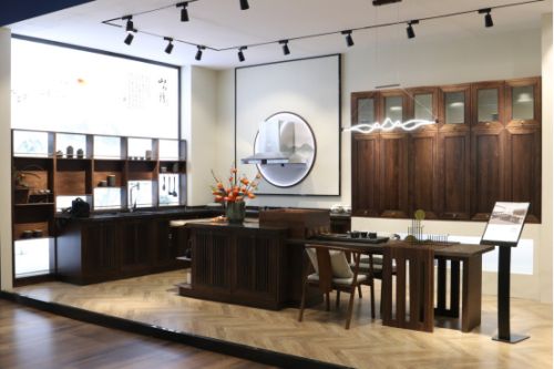 文兴琴:柏厨的定位一直是中国人的品质厨房,所以我们坚持将新中式主义做到极致。这次厨卫展不管是整个展厅的外观设计、内在的动线布局还是各种装饰元素,都运用了将传统文化元素和现代元素紧密结合的理念。通过有质感的低饱和度色块,让整个展厅既有格调又可以有温馨舒适的氛围。