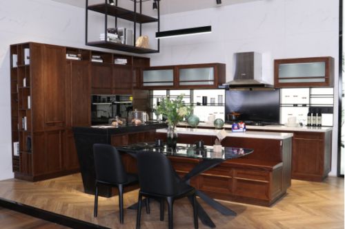 “中国禅”系列是第二代的升级款产品,它延续了中式禅意的美学,又融入了最新的编钟造型开放架。这个区域会让人联想到古代编钟乐器,令人置身于厨房,仿佛能听到编钟击罄的声音,让厨房具有更多的视听意象和感觉。同时它还有一个三星的茶台区域,让主人不仅能够在厨房做饭用餐,还可以品茗与三五知己畅聊人生。这套产品适合追求高风亮节、有雅致的人文雅士去选择和使用。