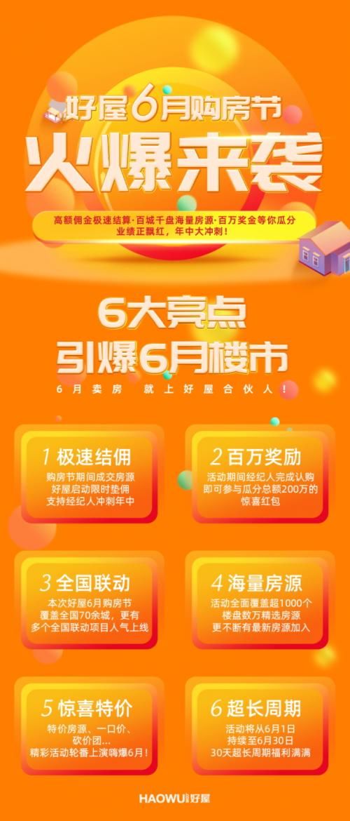 在这种市场条件下,行业里上下游都对即将到来的年中冲刺季充满干劲,好屋也不例外,在即将到来的火热六月,好屋联合全国百强开发商举办为期一月的“6月购房节“,以期打造一个房产界的“双十一狂欢节“。