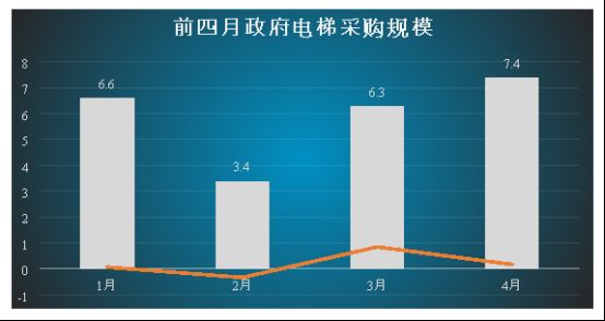 近日,政府采购信息网发布了2019年前四月的电梯采购数据,该统计数据显示,仅4月份,全国共完成电梯政府采购采购规模约7.4亿元,环比增长17.5%,同比增长42.3%。相比去年,2019年前四月电梯采购市场相比有所回暖,并刷新近五年来前四月的采购新高。