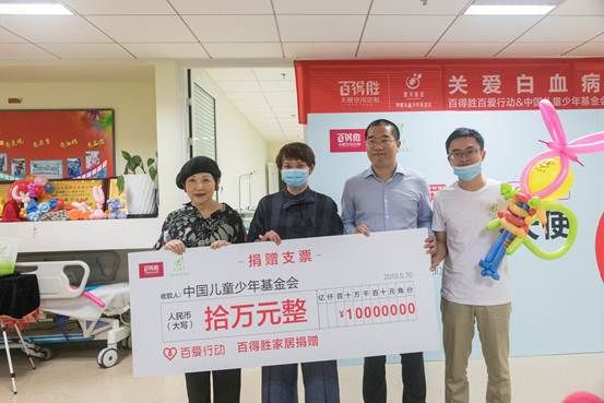 百得胜董事长兼执行总裁张健先生,代表百得胜家居向中国儿童少年基金会捐赠了10万元专项基金,用于帮助白血病患儿。