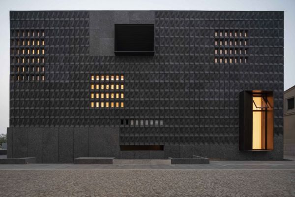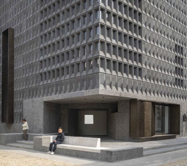 建筑立面主要由不同纹理的混凝土墙砖拼接而成,沉稳、厚重,有如一块坚韧的岩石,不断变换的环境中静驻不动。部分光滑的表皮折射出万象的天空,而模塑的混凝土砖外墙则充分与日光互动,营造出另一种变幻的肌理。厚重的建筑立面使用青铜元素点缀,捕捉了自然的天光,将行人的目光聚焦到陈列的橱窗。定制设计的照明与细节为朴实的色调增添了精致的细节。夜晚,室内的光线沿着倒锥形的空间散射出来,点亮了海滨的整片社区。