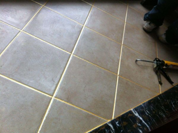 2、在打美缝剂时,每打一段距离,就要及时用刮板将瓷砖缝隙美缝剂刮平。