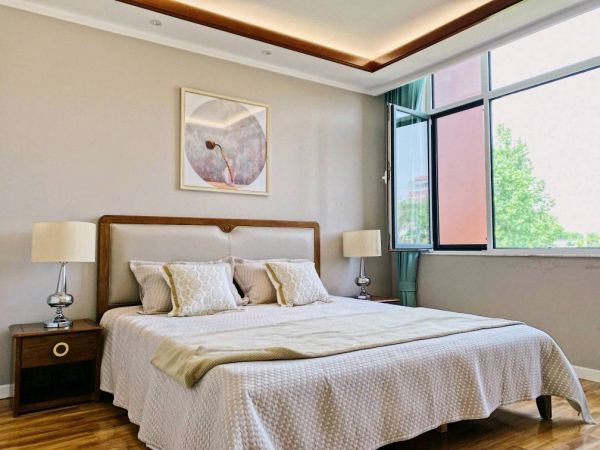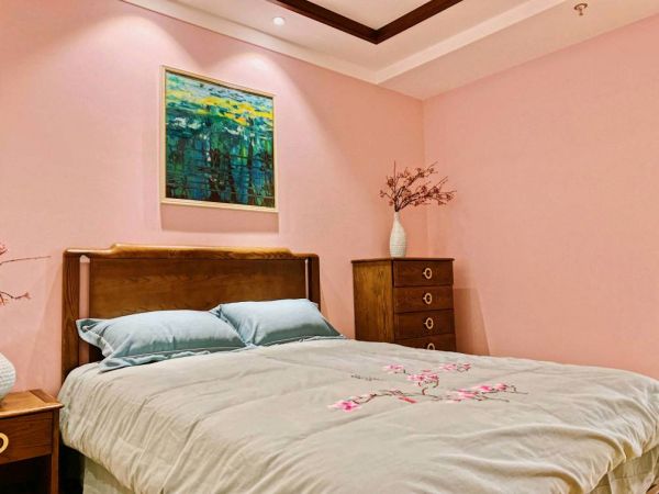 卧室以暖色为主,简洁的外观,舒服的造型,让整体看起来格外的温馨浪漫。同时,十分讲究居室内的细节装饰,床头装饰画、台灯、五斗柜以及陶瓷花瓶等装饰,都非常呼应赋有内涵,起到了“移步变景”的装饰效果,让人晚上安然如梦。