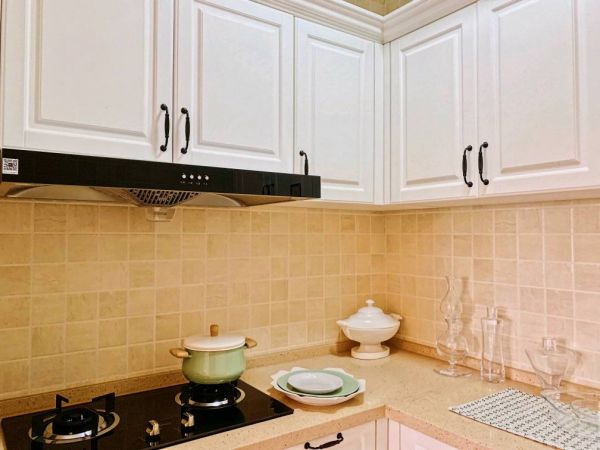 这款样板间的厨房以现代简约风为主,白色的橱柜配以黄色大理石操作台面,简约大方,操作起来便捷舒适。