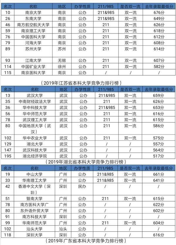 从各省份榜单表格可以看出,2019中国各地区大学综合竞争力排行榜中,北京市高校的综合实力最强,雄居全国各地区首位。江苏,上海,湖北,广东、湖南等地排位靠前。