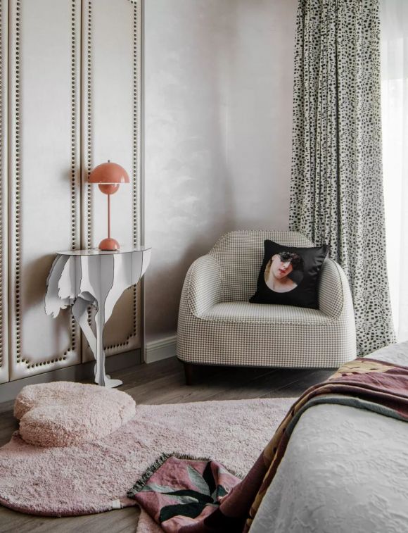 墙角的弧线处理与阳台呼应,一气呵成,很简约的细节设计对房间的采光有着意想不到的效果。相比白墙,艺术漆肌理墙面可以将物品的光彩放大。皮粉色的床和地毯,为空间赋予个性和温度。