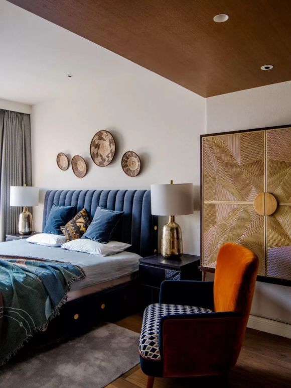 床头的手工制品,工艺精湛,历久弥新,搭配深蓝色天鹅绒材质的床,再添一把橙色的扶手椅,赋予空间一种优雅又异域的氛围。