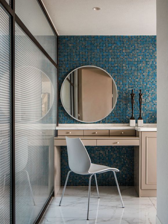 主卧套间的浴室通过改造后,发生了翻天覆地的变化,从暗卫到180度阳光直射,蓝色的马赛克瓷砖搭配白色的百叶窗,清晨苏醒的阳光在这里迎接每天的美好。