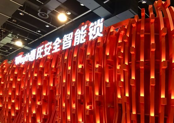 "惠氏安全盾”,是惠氏安全智能锁的展馆名称,其设计灵感来源于“盾”。盾有保护、守护的意味,展馆设计通过一块一块盾牌形状组砌而成,意旨惠氏安全智能锁的产品犹如盾牌般坚固、可靠地守护家庭的安全。