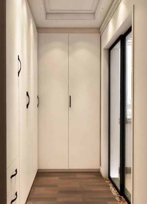 家里如果在进入卧室的地方,有这样一条长走廊,那么这里就是做衣帽间最好的地方,利用左右两侧的墙面,嵌入式的设计,让走廊也不会显得太过狭小。