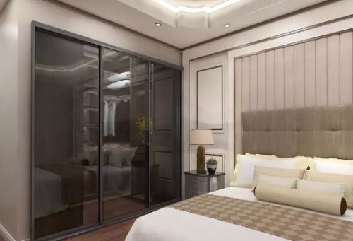 还可以把衣帽间的门改成玻璃,这样虽然衣帽间比较狭小一些,但在视觉上,还是能够显得比较大的。