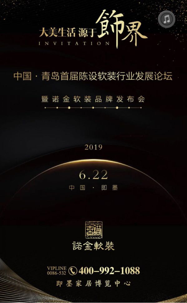 2019年,6月22日,青岛,即墨,中国青岛首届陈设软装行业发展论坛暨诺金软装品牌发布会即将启幕,敬请关注!