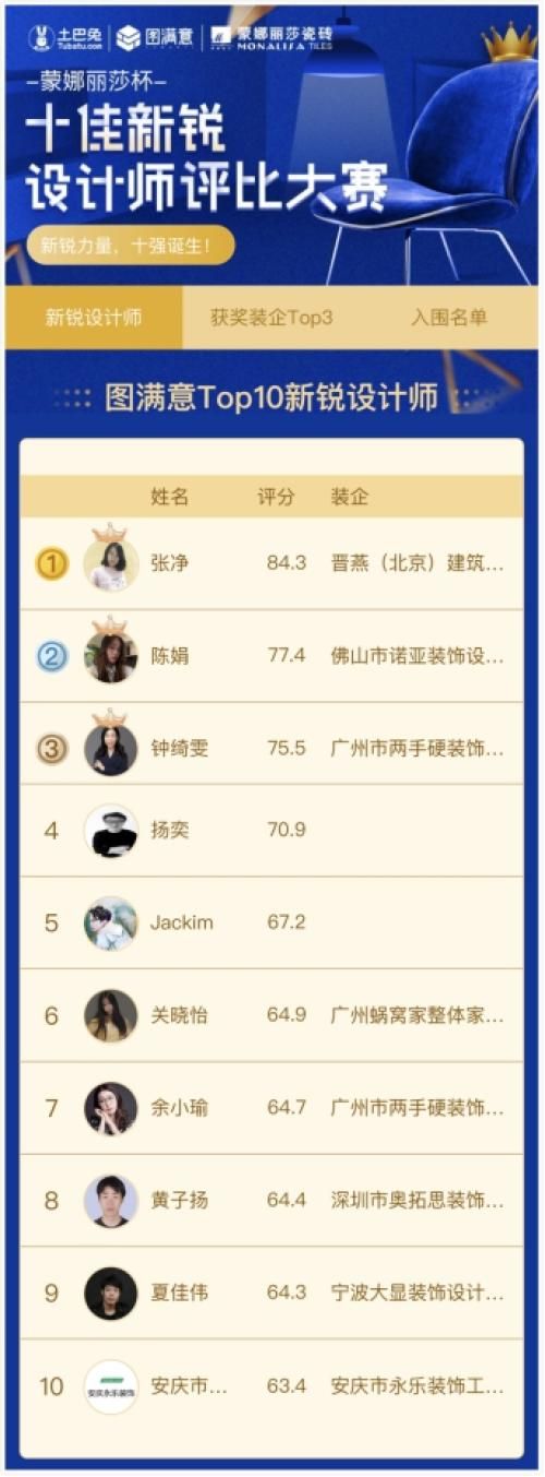 6月18日,由国内知名互联网家装平台土巴兔主办、高端建陶品牌蒙娜丽莎瓷砖冠名的新锐设计师评比大赛正式公布了获奖名单。