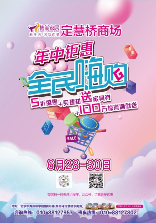 位于西四环定慧桥东南角的集美家居定慧桥商场,是品牌美誉度高,服务贴心、百姓信赖的家居商场,也是城区内饰家购物交通便利、享受限时免费停车服务的家居商场。尤其是商场在6月28-30日重磅推出“全民嗨购”酬宾营销活动,优惠力度大,有需求不能错过。