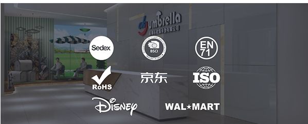 欧凯伞业自2010年创办以来,已全面通过ISO9001质量管理体系认证、DISNEY验厂、SEDEX验厂、Wal-mart验厂、BSCI验厂、京东验厂,并荣获AAA信用企业称号。