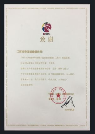 姚明董事长向江苏肯帝亚篮球俱乐部发来致谢信