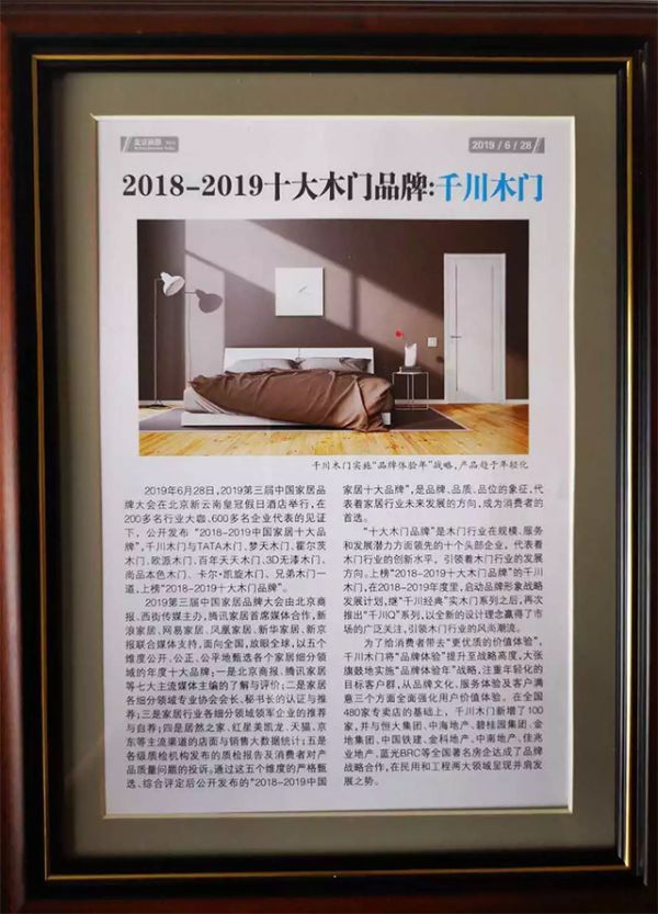 2019第三届中国家居品牌大会由北京商报、西街传媒主办,腾讯家居首席媒体合作,新浪家居、网易家居、凤凰家居、新华家居、新京报联合媒体支持,面向全国,放眼全球,以五个维度,公开、公正、公平的严格甄选出最具实力和价值的品牌,其含金量也是满满的。 千川木门再度荣膺“十大品牌木门”,也再次证明了行业和消费者对千川木门的肯定和认可。 严格遵从五个维度为标准: 1. 主流媒体家居主编的调查评价; 2. 家居各领域专业协会会长、秘书长的认证与推荐; 3. 行业领军企业的自荐与互荐; 4. 居然之家、红星美凯龙等主流渠道的店面呈现及大数据参考; 5. 各级质检机构的质量报告发布结果。 经过对五个维度甄选出来的品牌进行综合评定,脱颖而出的千川木门,可谓是名副其实!