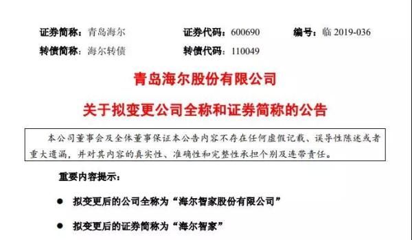 今年6月初,海尔宣布将公司名称由“青岛海尔股份有限公司”变更为“海尔智家股份有限公司”,体现全面进入智能家居领域的决心。7月1日,海尔相关名称、证券简称、英文名称等已完成了变更。