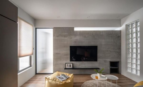 在纯白的基调下,用清水模漆刷出电视墙,让色彩微微律动,添抹空间层次;并借左右透明玻璃门砖,导入自然光,照映手作肌理的痕迹。大墙表情也非全面铺实,上方通透镂空如援引光带,下方契入方格引为陈列,安静之中透露活泼意趣。