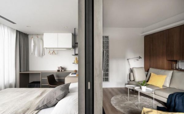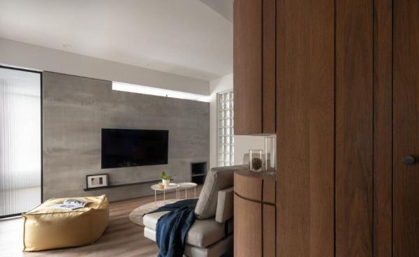 浅色木纹的地板从公共领域铺向寝卧,灰阶的清水模也从电视墙转身进入床头墙,冷与暖的平衡,不变的材质延伸,让整体的空间质感更趋简洁、自然而优雅。尤其主卧以玻璃拉门为设计,白天可收进墙体,让一致的设计语汇可内外合成一气。