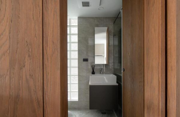 另一道墙于大面留白之中,在三分之一处巧用玻璃方砖砌筑如长型花窗,透过对向窗光的照映,将玻璃方砖的纹理折射出有机变化的自然光感,形成低调又别致的风景墙。主卧也以直纹雾玻拉门为呼应,让光线前后左右串联,放大空间感。