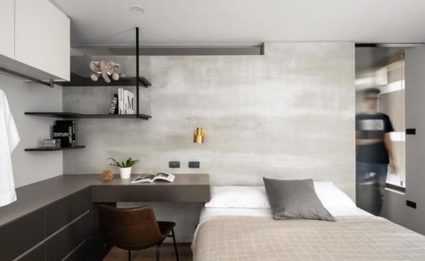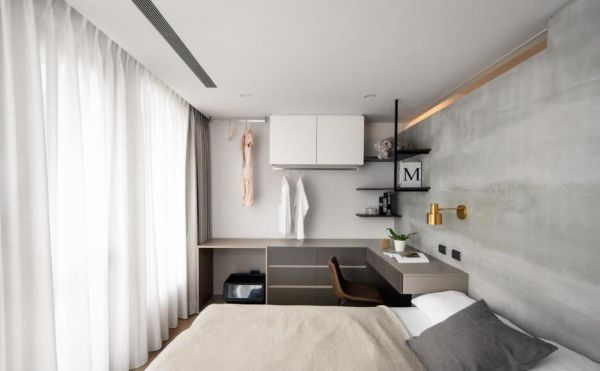 主卧以深灰木作铺陈的L型桌柜,以虚实相间的设计,巧妙结合收纳柜、化妆桌和书桌机能,墙面且以黑铁层板和白色格柜分别对应下方的机能属性;开放式的陈列架可置放书籍,封闭式的腰柜可整齐摆放衣物,或悬挂于墙上下错落的吊杆。
