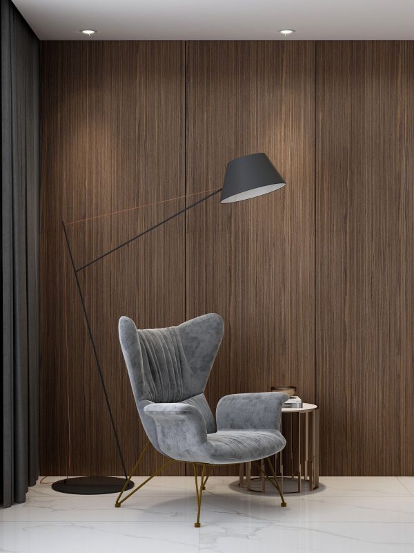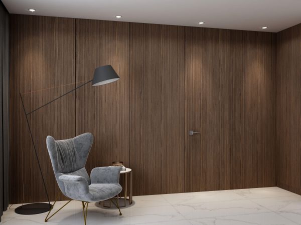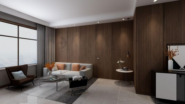 套间内整体设计采用意式极简风格,材质选用新型的染色木皮和超亚光工艺,新型的染色木皮用浸染方式取代传统的擦色手法,使木皮本身的纹理更清晰自然,超清底漆和面漆的涂装,使触感更加细腻。同时使用超哑零分光油漆取代传统三分光油漆,整体感觉稳重素雅,加上门款的窄边设计,更加符合极简的装饰风格。