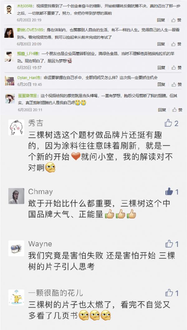 短片仅仅上线三天,就获得了人民日报、福建共青团、中国妇女报等党政媒体点名支持。内容话题获得超1.1亿次曝光,2100万余次视频播放,以及超过10万的用户参与话题讨论。不仅如此,这部五分钟的短片,更是被称为“2019高燃励志短片”。每个中国人的“开场”,正是三棵树品牌“开场“的缩影,在时代的庞大命题下,实现了品牌与广大用户的共鸣。