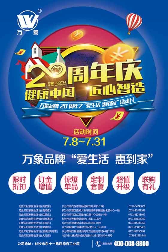 “万象”品牌是旺德府集团旗下的“背书”品牌,是湖南省著名、中国驰名的商标,其中万象板材更是行业内公认的“木制品专家”。2019年是旺德府集团成立的30周年,万象品牌创立的20周年,为答谢广大消费者的支持与厚爱,万象为消费者精心组织了数千款高品质的产品,精美超值的礼品,尊享实惠的政策来开展这场“爱生活 惠到家”的活动。
